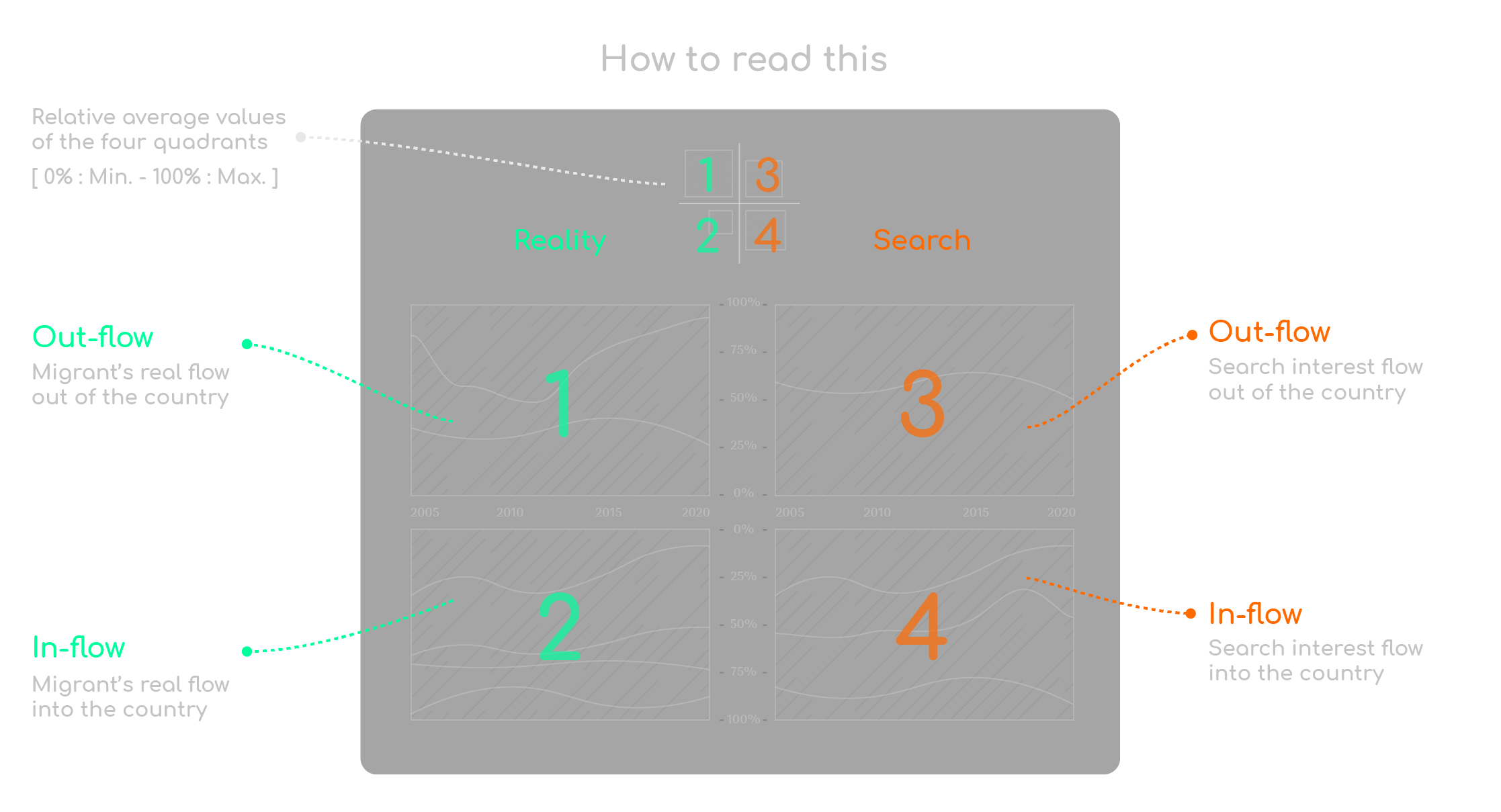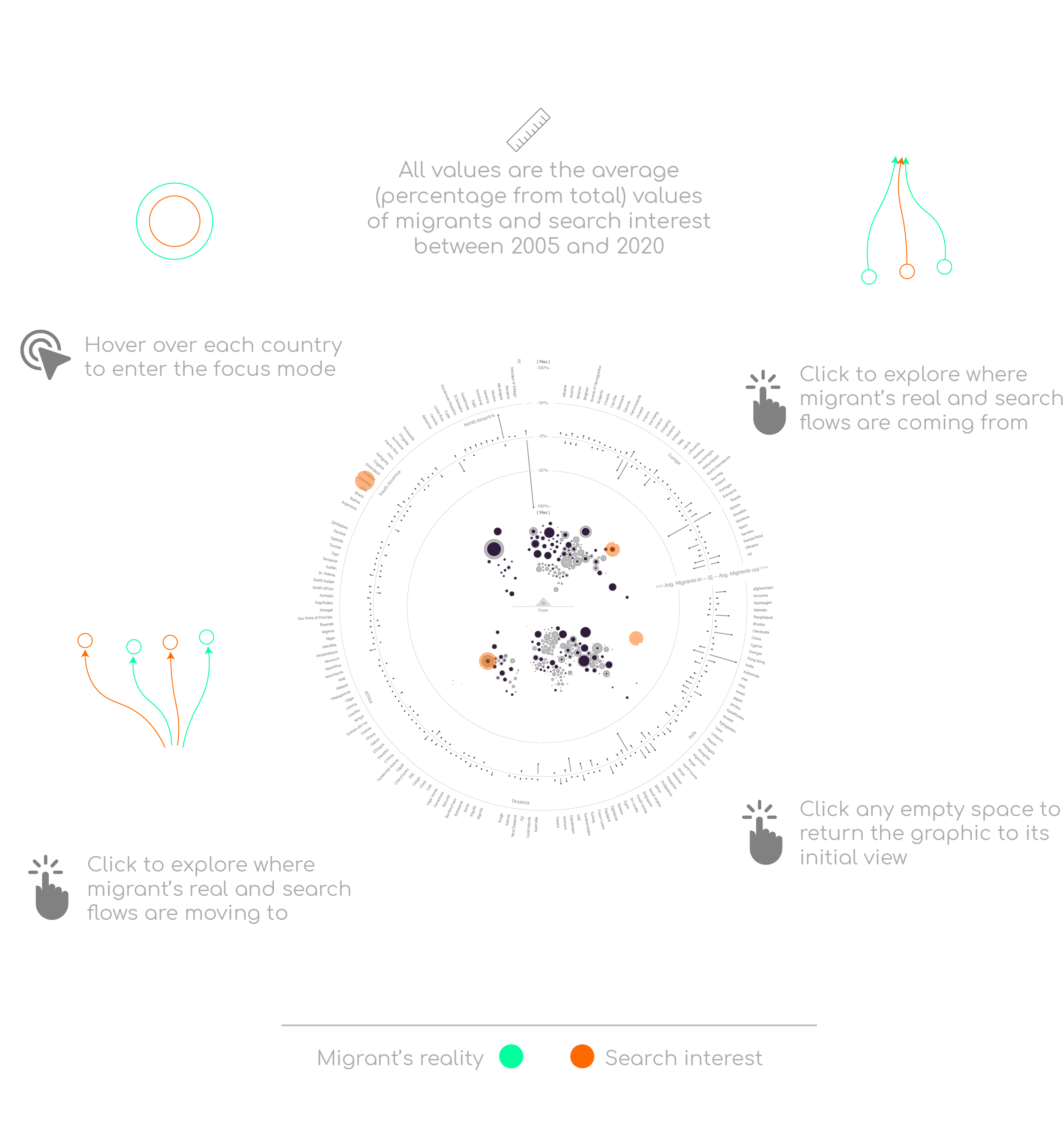 There are two maps inside the circle. The map on top represents the distribution of migrants and search interests to each country. The map at the bottom shows the distribution of migrants and research interests from each country.